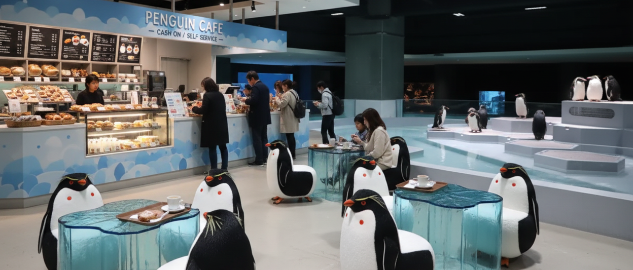 地元ベーカリーの焼きたてパンをはじめ、ペンギンをかたどったパフェや、クラゲをイメージしたドリンクなど、見ても楽しいメニューが揃っています。